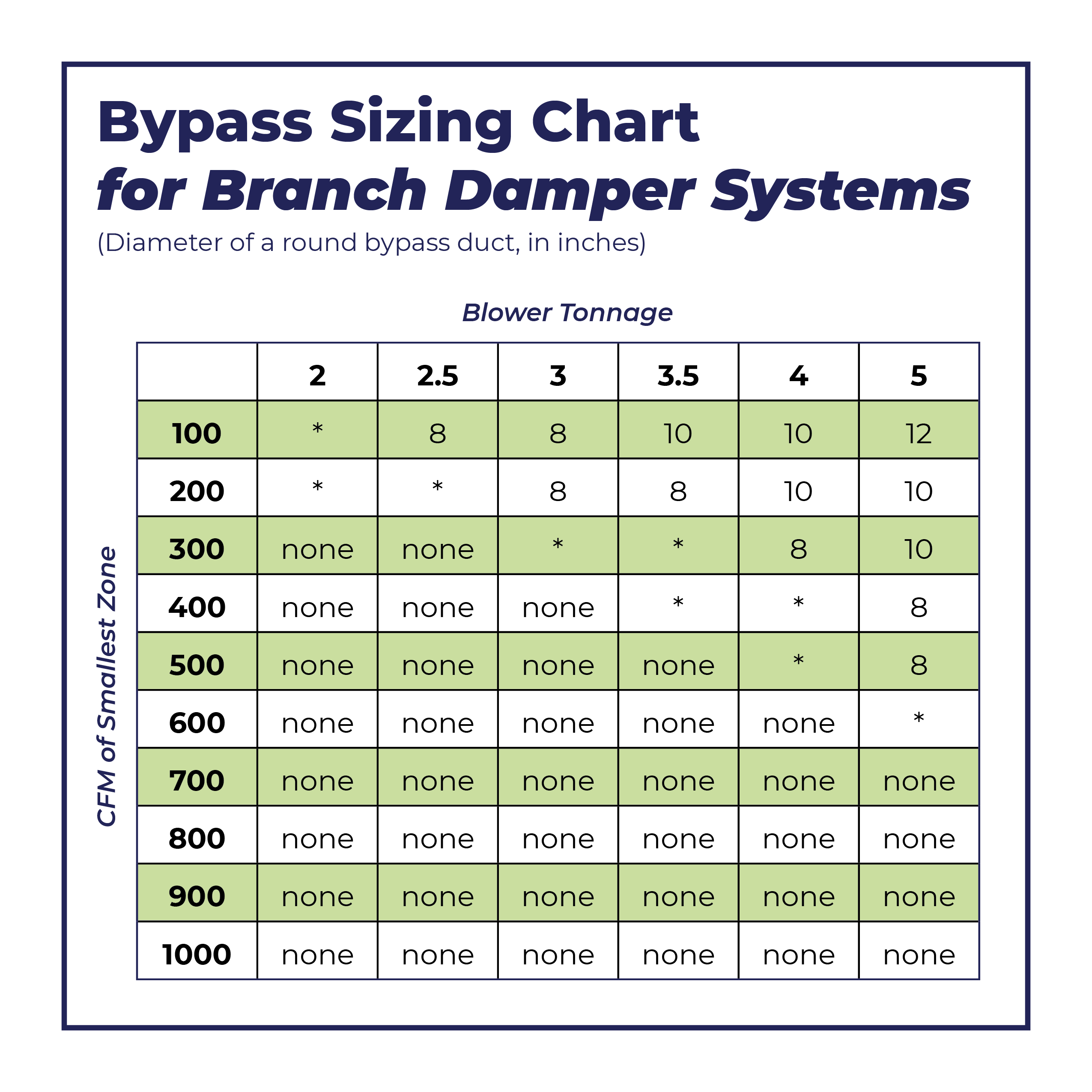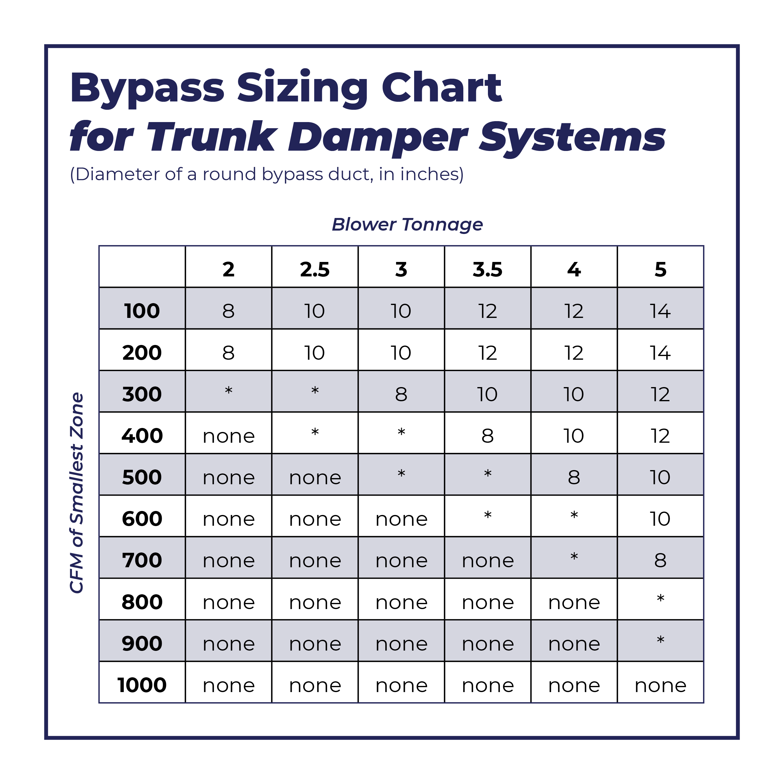 To use the bypass sizing chart, first choose whether you have a trunk damper system or a branch damper system. A trunk damper system will usually have one damper for each zone, located in the trunk lines of the ductwork. A branch damper system has multiple dampers on each zone, one for each branch run that goes to that zone.