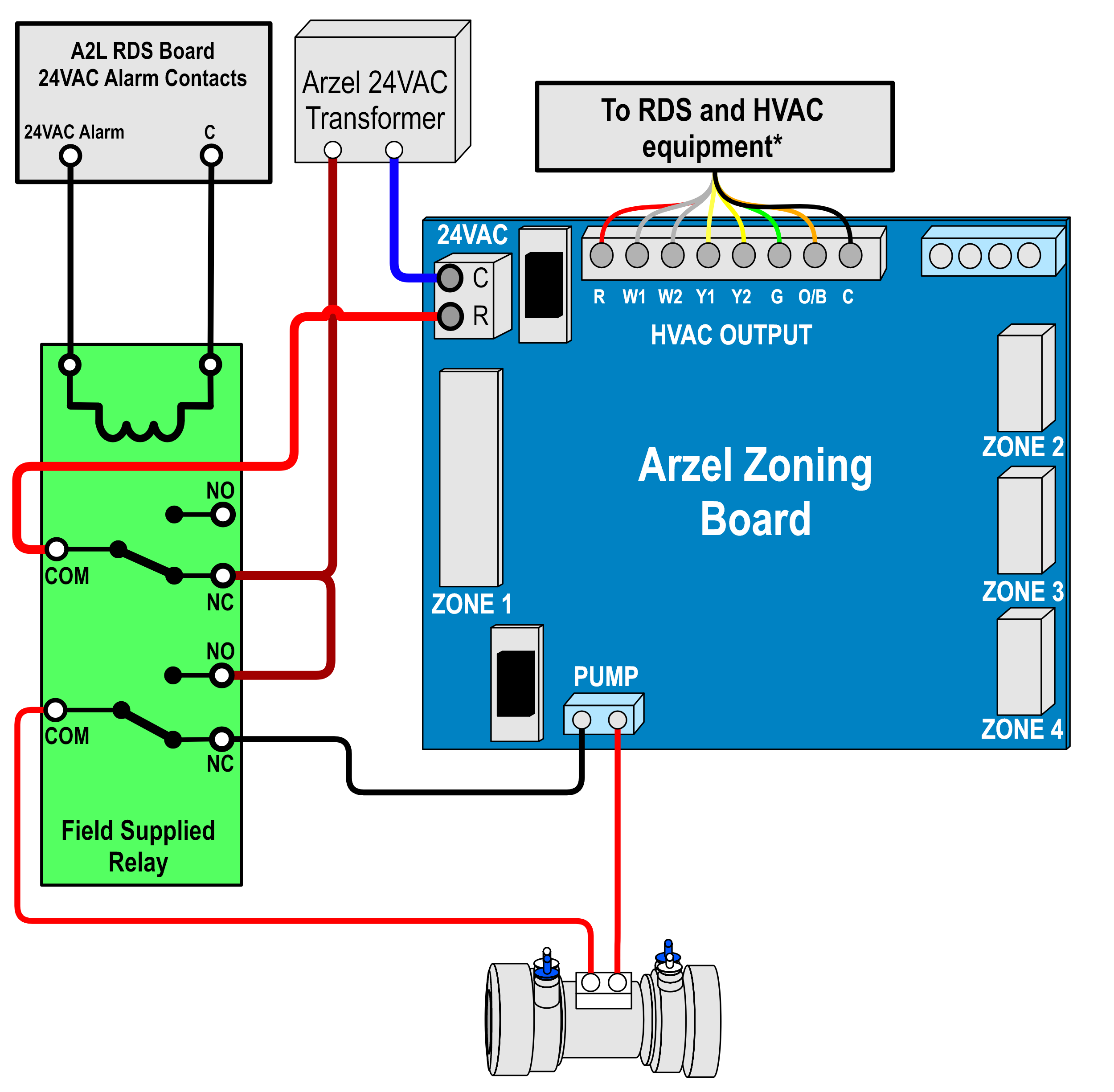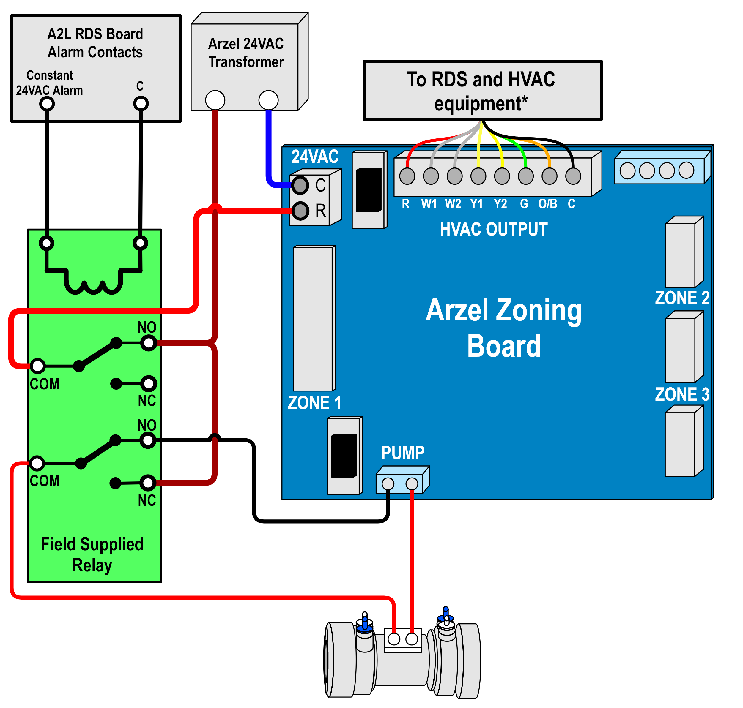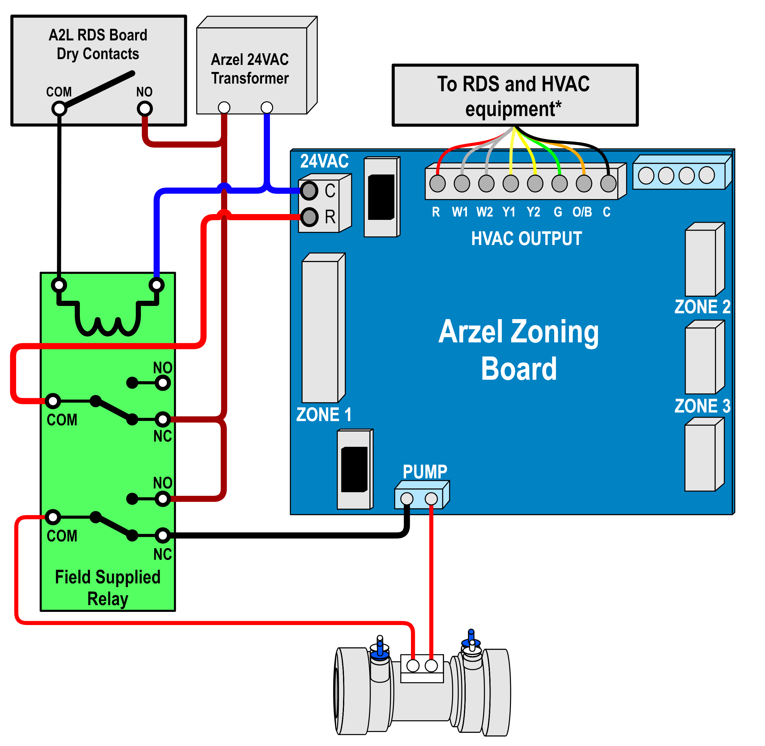 To add the necessary functionality to an Arzel Zoning system, follow the wiring diagram below. You will wire a double-pole double-throw relay to the mitigation board and the Arzel Zoning panel. This will shut off the panel and open all dampers in the event of a refrigerant leak.