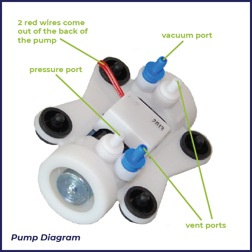 The pump has two ports on the front and two ports on the back. You can tell which side is the back because it has two red wires coming out of it. You’re going to test the vacuum and pressure on the back ports of the pump. The ports on the front of the pump are vent ports, and you want to avoid plugging these because plugging them can cause damage over time.