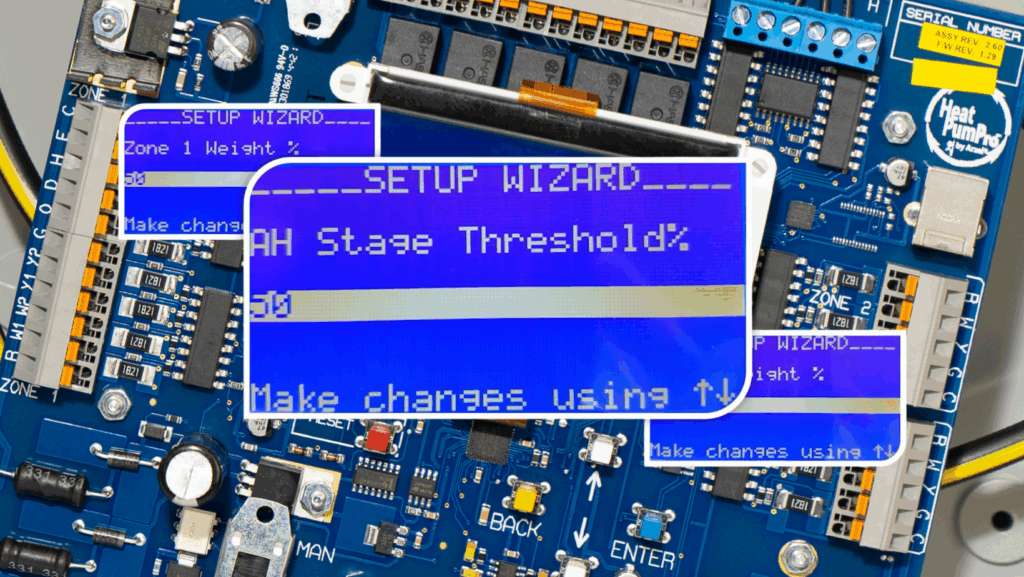 Here’s one more example to show how to set up zone weighting with the HeatPumPro. First, you’ll assign a zone weight to each zone. Then, you’ll set the air handler stage threshold. These settings work together to lock out second-stage operation when there isn’t enough ductwork open.
