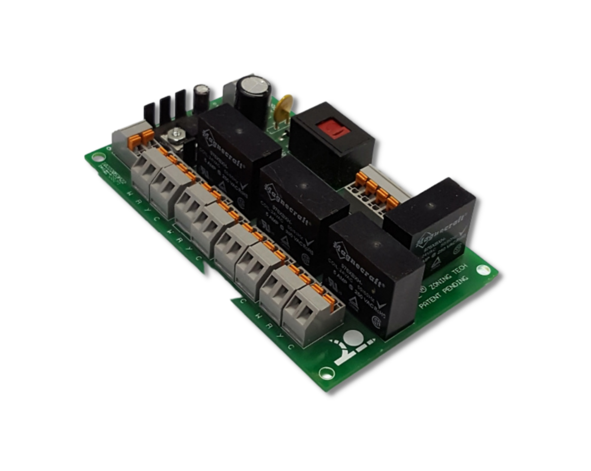 The zone valve interface (ZVI) board can be factory installed in panels to combine forced air zoning and hydronic zoning. It allows the use of a single thermostat in each zone.
